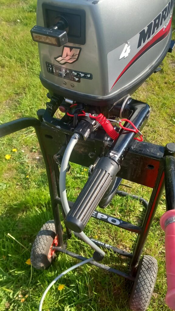 Een Mariner 4pk 4-takt langstaart buitenboordmotor Deze buitenboordmotor loopt en koelt goed en ziet er nog netjes uit.